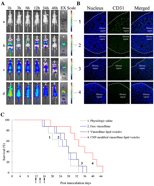 Figure 6: Real-time imaging and overall anticancer efficacy in glioma-bearing mice in vivo. Notes: (A) in vivo real-time images and ex vivo images of glioma-bearing brains and organs at 48 h; a, physiologic saline; b, free DiR; c, DiR lipid vesicles; d, CNP-modified DiR lipid vesicles. (B) disruptive effects on brain glioma neovasculatures in glioma-bearing mice. Glioma neovasculatures are indicated as green fluorescence stained by anti-CD31 antibody. White lines indicate the boundary between the brain-glioma region and normal brain tissue. (C) Kaplan–Meier survival curves of glioma-bearing mice treated with various formulations (n = 8). 1, physiologic saline; 2, free vinorelbine; 3, vinorelbine lipid vesicles; 4, CNP-modified vinorelbine lipid vesicles.