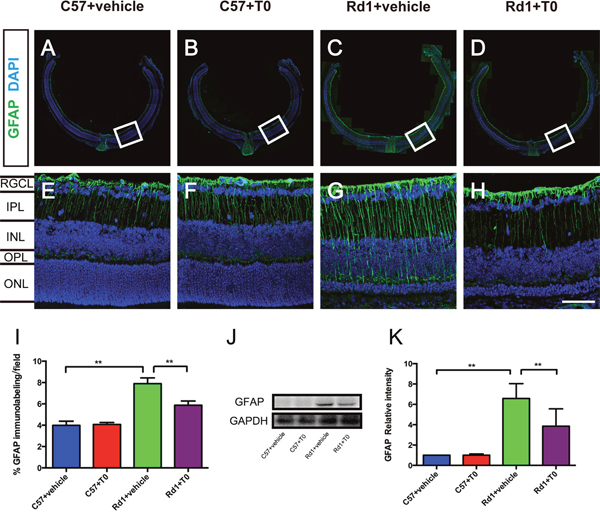 Figure 3: T0 treatment decreases the overexpression of GFAP in rd1 mice. (A-H) Representative images of GFAP expression in C57 and rd1 mice pretreated with T0 or vehicle. (E-H) Images are higher-power views of the boxed areas in A-D. (I) Quantitative analysis of the density of GFAP expression in the higher-power fields of each group in E-H. (J) Representative western blot of retina lysates from C57 and rd1 mice pretreated with T0 or vehicle. (K) The retina from rd1 mice shows significantly more GFAP/GAPDH than that from C57 mice, while T0 treatment significantly reduces this level. RGCL, retinal ganglion cell layer; IPL, inner plexiform layer; INL, inner nuclear layer; OPL, outer plexiform layer; ONL, outer nuclear layer. Data are presented as the mean ± SEM. n=5 mice per group. **P< 0.01. Scale bar in H=75 μm and applies to (E-H).