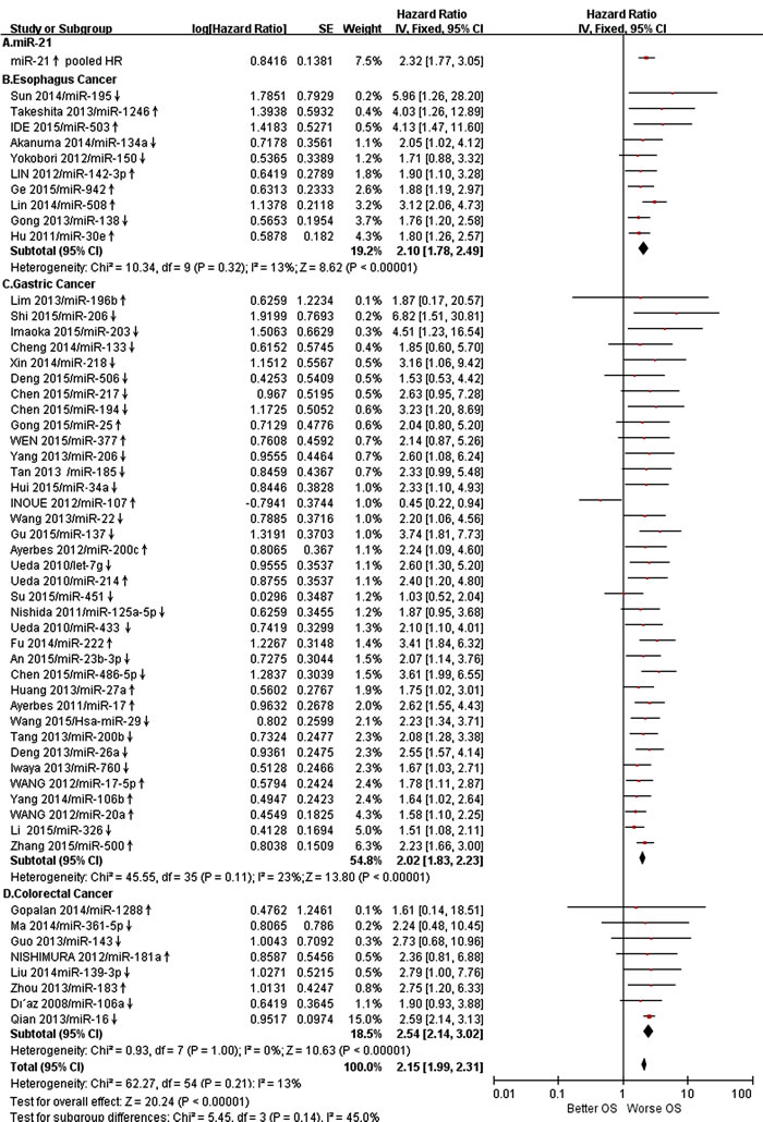 Gastrointestinal cancers (GICs) mainly including esophageal cancer (EC), gastric cancer (GC) and colorectal cancer (CRC), are the most common cause of cancer-related death leading into high mortality worldwide, and it is still among the highest threatening risk of public health for past decades [1]. Actually, GIC patients at early stage could be cured successfully by receiving proper treatment (adjuvant chemotherapy or radiotherapy after radical resection) following approximately 90% five-year overall survival rate. However, five-year overall survival rate will decline to merely 15% when develop into advanced stage [2, 3]. Therefore, early diagnosis and prediction of individual prognosis play pivotal roles in the treatment and recovery of patients. However, there still lack of effective methods to evaluate the prognosis of GIC patients based on clinicopathology. Currently, increasing studies have reported that aberrant expression of specific microRNAs (miRs) as stable molecular biomarkers was associated with the prognosis of GIC patients and related to the targeted therapy, which provides potentially novel prevention strategies and advanced therapies [4-6].