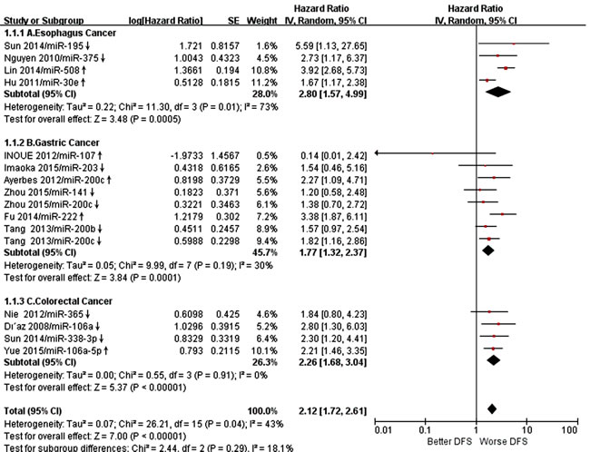 Two reviewers read the studies intensively and evaluated the eligibility of studies independently based on selection criteria involving inclusion criteria: (1) Patients were diagnosed with gastrointestinal cancer by histopathology; (2) MiRs as prognostic markers were used to predict the prognosis for full stage (I-IV) patients. (3) Control group (healthy people or patients without GIC) was contained; (4) The effective outcomes were OS, DFS, HR and 95% CI; (5) Observational studies that we can extract the survival data from the articles or Kaplan-Meier survival curve were included; and exclusion criteria: (1) Non-English and non-human subject studies were excluded; (2) Studies were letters, reviews and reports lack of survival data; (3) Studies focused on genetic alterations about the polymorphisms or modification of miRs. We would get to consensus finally through discussion when disagreements came out.