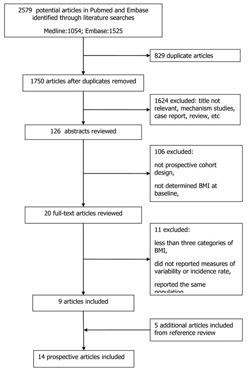 Figure 1 shows a flow chart of our selection process. Our initial search yielded 2579 independent citations via database search. Of these, 2453 articles were excluded considering of potential value after excluding the duplicate or not relevant articles, mechanism studies, case reports or reviews. Furthermore, 106 articles were excluded following an initial screen of abstracts, and the other 11 papers were excluded after reviewing full-texts because of a lack of results reported BMI and bladder cancer. The remaining 9 articles finally met all the selection criteria. Of note, 5 additional articles were included from references review. Thus, a total of 14 articles (involving 12,642 cases) with a sample size of 5,640,760 participants were included in our meta-analysis.