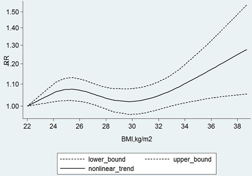 A dose-response analysis was conducted based on the category data of BMI, number of cases, person-years and logarithm of RRs and its corresponding standard error. The eligible studies should provide sufficient information across at least three categories of exposure. Among the studies, we assigned a median of BMI for each category. For the open-ended upper category, the amplitude was assumed the same as the previous one. We transformed category-specific risk estimates into estimates of the relative risk (RR) associated with every 5 kg/m2 increase on BMI by used of the method of generalized least-squares for trend estimates.9 The potential nonlinear dose-response relationship between BMI and bladder cancer risk was examined using a two-stage hierarchical regression model [31]. Data were modeled with random-effects restricted to cubic spline models with 4 knots and using the Greenland and Longnecker method to estimate the covariances of multivariable-adjusted relative risks [32].