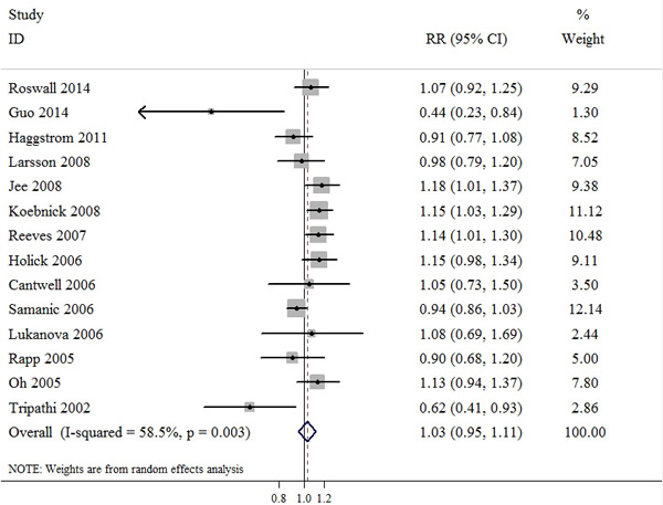Figure 3: Meta-analysis of studies that examined the association between overweight category and bladder cancer risk.
