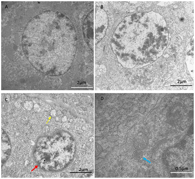 Figure 1: The results of transmission electron microscopy. The results showed ultrastructure of spleen in control group (A), Se+Pb group (B) and Pb group (C and D). The Pb group showed mitochondrial vacuole (yellow arrows), chromatic agglutination (red arrow) and the formation of the autophagosome (blue arrows). The pathological injuries in Se+Pb group were almost close to normal level.