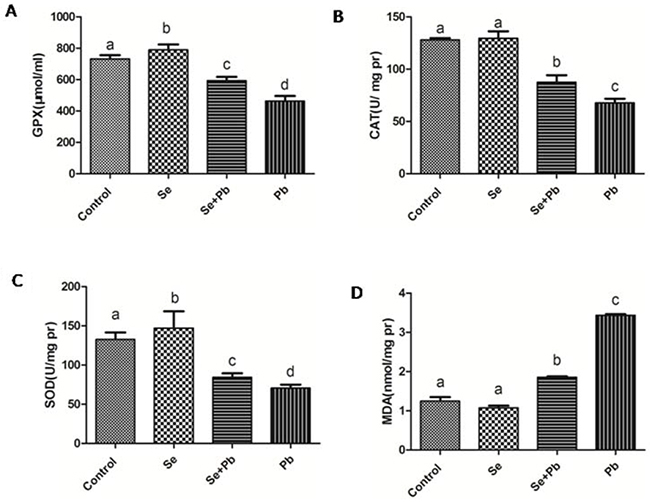 Figure 2: Effects of Se, Pb and Se+Pb treatment on the activities of GPX (A), CAT (B), SOD (C) and MDA (D) level in the spleen of chickens. Each value represents the mean±SD (n=6/group). The bars sharing different small letters represent statistically significantly differences between the groups (P < 0.05); the bars with a common letter are not significantly different (P > 0.05).