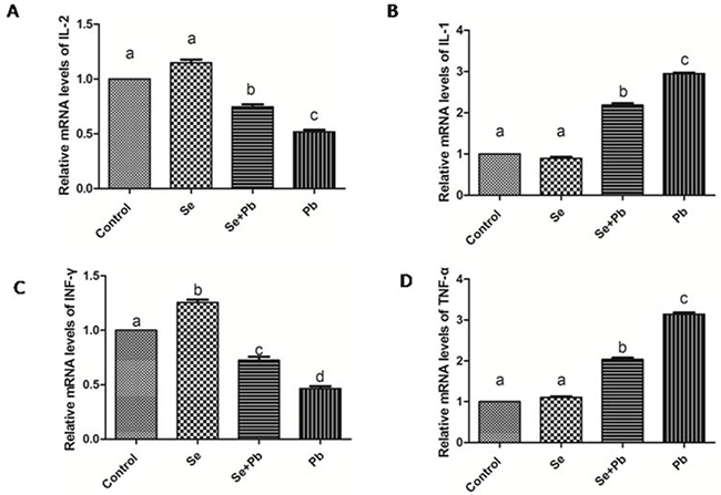 Figure 3: Effects of Se, Pb and Se+Pb treatment on the activities of IL-2 (A), IL-1 (B), INF-γ (C) and TNF-α (D) in the spleen of chickens. Each value represents the mean±SD (n=6/group). The bars sharing different small letters represent statistically significantly differences between the groups (P < 0.05); the bars with a common letter are not significantly different (P > 0.05).