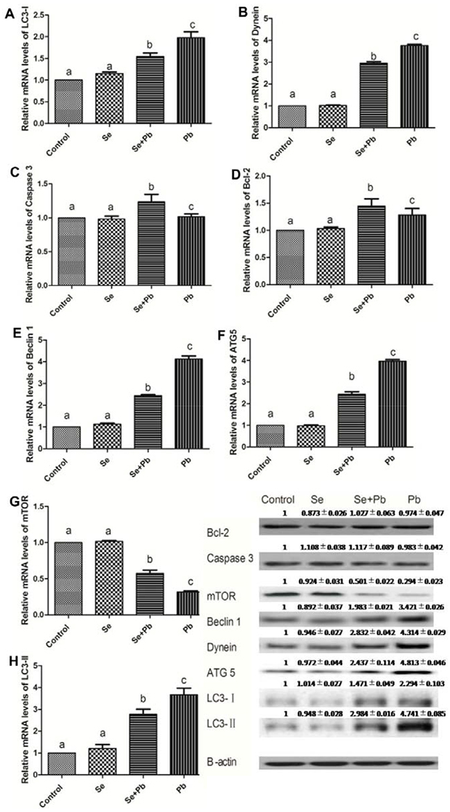 The results showed that in the Se group, the expression levels of the autophagy/apoptosis-related genes did not exhibit significant difference when compared with the control group (P > 0.05). The Pb treatment up-regulated the expression levels of Bcl-2, Caspase 3, Atg5, Beclin-1, Dynein, LC3-I and LC3-II and down-regulated the expression levels of mTOR when compared with the control group (P < 0.05). The Se+Pb group remarkably alleviated these changes when compared with the Pb group (P < 0.05) (Figure 4).