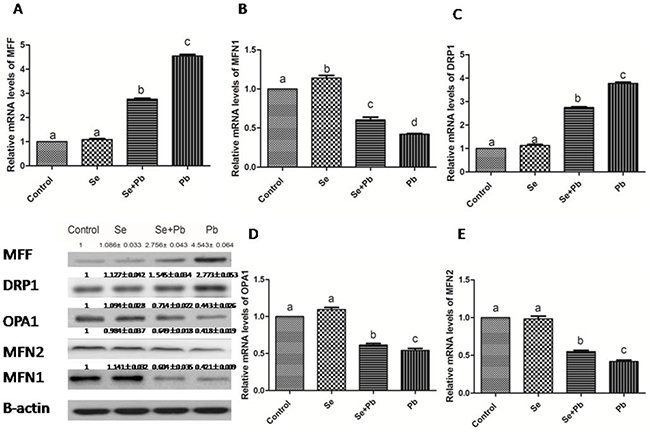 Figure 5: Effects of Se, Pb and Se+Pb treatment on the expressions of MFF (A), MFN1 (B), DRP1 (C), OPA1 (D) and MFN2 (E) in the spleen of chickens. Each value represents the mean±SD (n=6/group). The bars sharing different small letters represent statistically significantly differences between the groups P < 0.05); the bars with a common letter are not significantly different (P > 0.05).