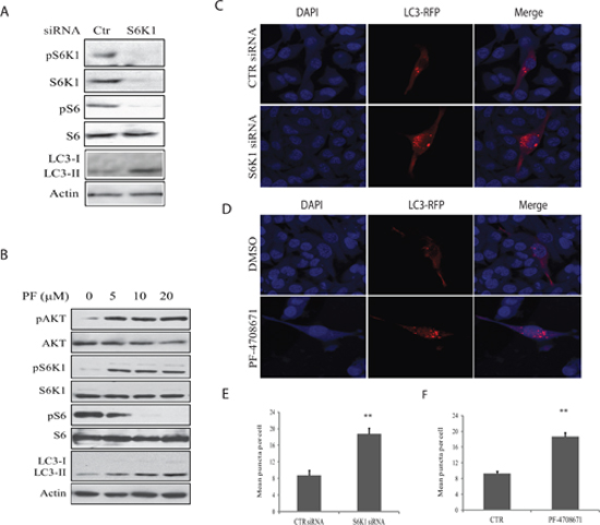 Figure 4: Role of S6K1 in autophagy. (A) The effect of S6K1 knockdown on LC3-II lipidation.A375 cells were transfected with scrambled or S6K1 siRNA (2.5 nmole each). After incubation for 48 hr, the cells were harvested and analyzed for S6K1 expression and phosphorylation of the indicated proteins by Western blot. (B) The effect of the S6K1 inhibitor on LC3-II expression.A375 cells seeded in a 6-well plate were incubated in complete DMEM medium in the absence or presence of the indicated concentrations of PF-4708671 for 16 hr. Cells were harvested and analyzed for LC3 and actin expression by Western blot. (C) The effect of S6K1 knockdown on autophagosome formation. A375 cells seeded on the coverslips were first transfected with scrambled or S6K1 siRNA (2.5 nmole each). After incubation overnight, the cells were transfected with pmLC3-RFP expression vector. After incubation for 48 hr, the cells were fixed in methanol and visualized for autophagosomes under a fluorescent microscope. (D) The effect of the S6K1 inhibitor on LC3-II expression.A375 cells seeded on coverslips were transfected with LC3-RFP expression vector. After incubation for 24 hr, the cells were treated with PF-4708671 (10 μM) for 16 hr. Cells were fixed in methanol and visualized for autophagosomes under a fluorescence microscope. (E & F) The puncta of autophagosomes were counted under a fluorescent microscope plotted in a bar graph with statistical analysis. **p<0.01, compared to the control.