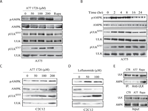 Figure 5: A77 1726 induces AMPK and ULK1 phosphorylation. (A & B) Time- and dose-dependent induction of AMPK and ULK1 phosphorylation by A77 1726. A375 cells were incubated in complete DMEM medium in the absence or presence of the indicated concentrations of A77 1726 for 16 hr (A) or in the presence of A77 1726 (200 μM) for the indicated time (B). (C & D) Dose-dependent induction of AMPK and ULK1 phosphorylation by A77 1726 (C) or leflunomide (D) in C2C12 myotubes. C2C12 cells were seeded in 6-well plates and differentiated into myotubes. Myotubes were treated with the indicated concentrations of A77 1726 or leflunomide for 16 hr. Cell lysates were prepared and analyzed by Western blot with the indicated antibodies. (E) A77 1726 does not disrupt AMPK and ULK1 interaction. A375 cells were incubated in the absence or presence of A77 1726 (200 μM) or rapamycin (20 nM) for 16 hr. Cell lysates were immunoprecipitated with an anti-ULK1 antibody, followed by Western blot analysis with an anti-ULK1 or anti-AMPK antibody. Unimmunoprecipitated cell lysates were included as input controls.