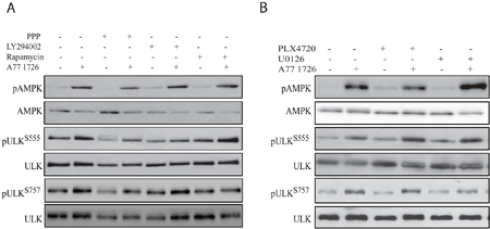 Figure 6: A77 1726-induced AMPK and ULK1 phosphorylation is independent of the feedback activation of the PI-3 and MAP kinase pathways. (A) A375 cells seeded in 6-well plates were pre-treated with vehicle (0.1% dimethyl sulfoxide), PPP (1 μM), LY294002 (10 μM), or rapamycin (20 nM) for 1 hr, followed by addition of A77 1726 (200 μM) and incubation for 16 hr. Cells were harvested and analyzed for AMPK and ULK1 phosphorylation. (B) A375 cells seeded in 6-well plates were pre-treated with vehicle (0.1% dimethyl sulfoxide), PLX4720 (1 μM), U0126 (10 μM), or PD98059 (10 μM) for 1 hr, followed by addition of A77 1726 (200 μM) and incubation for 16 hr. Cells were harvested and analyzed for ULK and AMPK phosphorylation with indicated antibodies.
