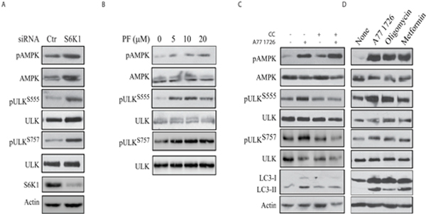 To confirm that A77 1726-induced AMPK and ULK1 phosphorylation was mediated by inhibiting S6K1 activity, we tested if S6K1 knockdown or inhibition of S6K1 activity by PF-4708671 also led to increased AMPK and ULK1 phosphorylation. As shown in Figure 7A, suppression of S6K1 expression led to increased AMPK and ULK1 phosphorylation at S555 and S757. PF-470867 induced AMPK phosphorylation in a dose-dependent manner (Figure 7B). Due to its strong ability to induce the feedback activation of the PI-3 kinase pathway, PF-470867 induced ULK1 phosphorylation at S555 and S757 even at low concentrations (Figure 7B). These results collectively suggest that inhibition of S6K1 activity plays a critical role in inducing AMPK and ULK1 phosphorylation.