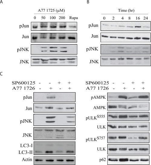Figure 9: JNK activation is required for A77 1726-induced p62 expression. A375 cells were treated with the indicated concentration of A77 1726 or rapamycin (20 nM) (A) for 16 hr or treated with A77 1726 (200 μM) for the indicated time (B). (C) A375 cells were treated in the absence or presence of A77 1726 (200 μM) and/or SP6000125 (10 μM) for 16 hr. Cell lysates were prepared and analyzed for the protein levels with the indicated antibodies.