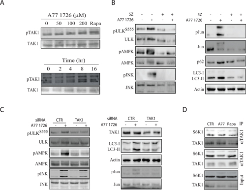 Figure 11: TAK1 mediates A77 1726-induced AMPK and JNK activation. (A) A77 1726 induces TAK1 phosphorylation. A375 cells were incubated in the absence or presence of the indicated concentrations of A77 1726 or rapamycin (20 nM) or A77 1726 (200 μM) for the indicated time. Cell lysates were analyzed with an anti-TAK1T184/187 phosphorylation antibody, followed by re-probing with an anti-TAK1 antibody. (B) The effect of the TAK1 inhibitor on protein phosphorylation and LC3-II levels.A375 cells were treated with A77 1726 (200 μM) and/or 5Z (5 μM) for 16 hr. Cell lysates were analyzed for the phosphorylation of indicated proteins by Western blot. (C) The effect of TAK1 knockdown on protein phosphorylation and LC3-II levels.A375 cells were transfected with scrambled or TAK1 siRNA (2.5 nmole each). After incubation for 48 hr, the cells were left untreated or treated with A77 1726 for 16 hr. Cells were harvested and analyzed for the indicated proteins by Western blot. (D) S6K1 interacts with TAK1. A375 cells seeded in a 6-well plate were incubated in the absence or presence of A77 1726 (200 μM) or rapamycin (20 nM) for 16 hr. Cell lysates were immunoprecipitated with an anti-TAK1 or anti-S6K1 antibody, followed by Western blot analysis with an anti-TAK1 and anti-S6K1 antibodies. Unimmunoprecipitated cell lysates were included as input controls.
