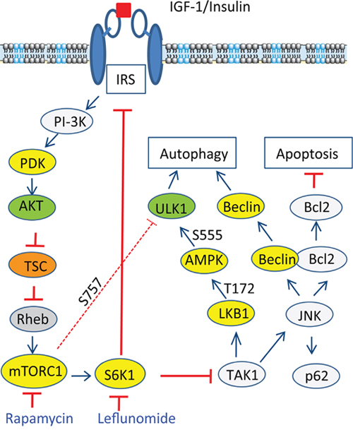In summary, our study showed that inhibition of S6K1 by A77 1726 led to the activation of AMPK and JNK, both of which contributed to A77 1726-induced autophagy. We further showed that AMPK phosphorylation at T172 and activation led to ULK1 phosphorylation at S555, which overcame the inhibitory effect of ULK1 S757 phosphorylation mediated by feedback-activated mTOR. We further showed that A77 1726 activated AMPK and JNK through S6K1 inhibition-mediated TAK1 activation (Figure 12). Our studies reveal a novel mechanism by which the mTOR-S6K1 pathway connects to the AMPK-ULK1 pathway through TAK1 to regulate autophagy (Figure 12).
