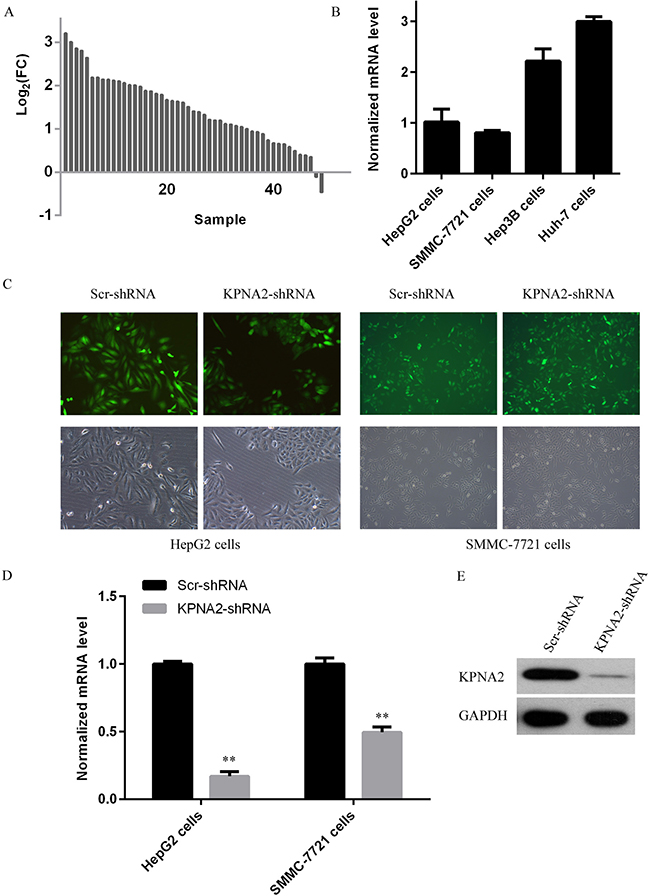 Figure 1: KPNA2 expression status and its knockdown at both the mRNA and the protein levels in human hepatocellular carcinoma cell lines HepG2 and SMMC-7721 using a lentivirus-mediated shRNA strategy. (A) Line chart for KPNA2 expression at the mRNA level in human hepatocellular carcinoma tissues and adjacent normal tissues obtained from the TCGA database. A total number of 50 paired lung adenocarcinoma samples were used (B) KPNA2 expression in four different human hepatocellular carcinoma cell lines, HepG2, SMMC-7721, Hep3B and Huh-7 cells was analyzed with quantitative real-time PCR analysis (normalized to GAPDH mRNA). (C) Microscopic images of HepG2 cells and SMMC-7721 cells infected for 48 hours with lentiviruses expressing either Scr-shRNA or KPNA2-shRNA. The upper images were prepared using a fluorescent microscope and show GFP-positive cells; the bottom images were prepared using a light microscope. Magnification: 100 ×. (D) The relative KPNA2 mRNA levels in HepG2 cells and SMMC-7721 cells infected with lentiviruses expressing either Scr-shRNA or KPNA2-shRNA was determined by quantitative real-time PCR (normalized to GAPDH mRNA). The data shown here are from one out of three independent experiments (**p < 0.01). (E) The relative KPNA2 protein level in 293T cells transfected with a plasmid expressing either Scr-shRNA or KPNA2-shRNA was determined by immunoblotting. The GAPDH protein level was used as an internal control.