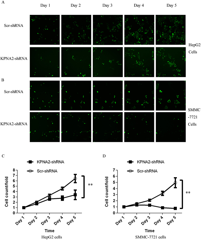Figure 2: Inhibition of cell proliferation by silencing KPNA2 in human hepatocellular carcinoma cell lines HepG2 and SMMC-7721, measured via the Cellomics ArrayScan VTI. (A–B) Representative microscope images of HepG2 cells (A) and SMMC-7721 cells (B) infected with lentiviruses expressing either Scr-shRNA or KPNA2-shRNA at different time points. (C–D) Proliferation profiles of HepG2 cells (C) and SMMC-7721 cells (D) infected with Scr-shRNA or KPNA2-shRNA, determined over five continuous days by the Cellomics ArrayScan VTI. The data shown here are fold changes in the number of cells and represent the mean ± SEM of three separate experiments (**p < 0.01).