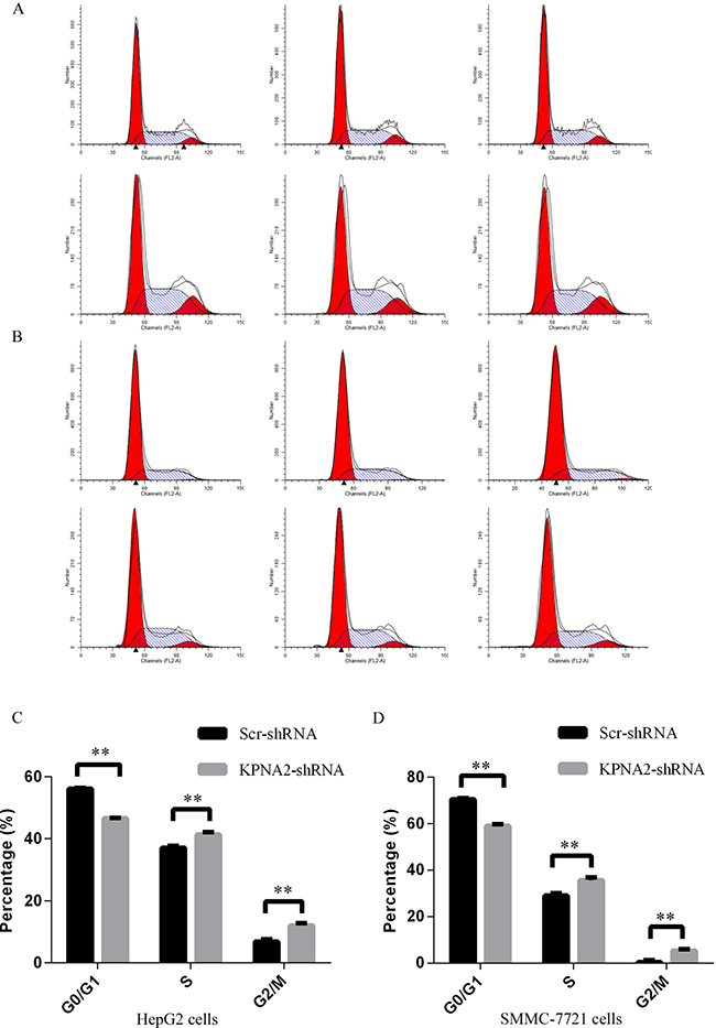 Figure 4: Cell cycle arrest induced in human hepatocellular carcinoma cell lines HepG2 and SMMC-7721 with KPNA2 knockdown. (A–B) Representative images of cell cycle analysis for the human HepG2 cells (A) and SMMC-7721 cells (B) infected with Scr-shRNA (top) or KPNA2-shRNA (bottom). (C–D) Cell cycle distribution in HepG2 cells (C) and SMMC-7721 cells (D) infected with Scr-shRNA or KPNA2-shRNA. Both cell types infected with lentiviruses expressing either Scr-shRNA or KPNA2-shRNA were cultured for 4 days and resuspended to seed into 6-well plates for another 48 hours of culture. Cell cycle analysis was performed with flow cytometry. The graph shows the mean ± SEM of the proportion of cells in the G1 phase, S phase and G2/M phase from three separate experiments (**p < 0.01).