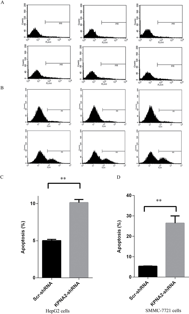 Figure 5: Cell apoptosis induced in human hepatocellular carcinoma cell lines HepG2 and SMMC-7721 with KPNA2 knockdown. (A–B) Representative images of cell apoptosis analysis for the human HepG2 cells (A) and SMMC-7721 cells (B) infected with Scr-shRNA (top) or KPNA2-shRNA (bottom). (C–D) Cellular apoptosis in HepG2 cells (C) and SMMC-7721 cells (D) infected with Scr-shRNA or KPNA2-shRNA. Both cell types infected with lentiviruses expressing either Scr-shRNA or HSDL2-shRNA were cultured for 4 days and then resuspended for apoptosis analysis using the ANNEXIN-V assay and flow cytometry. The data shown are the mean ± SEM of apoptosis rate from three separate experiments (**p < 0.01).