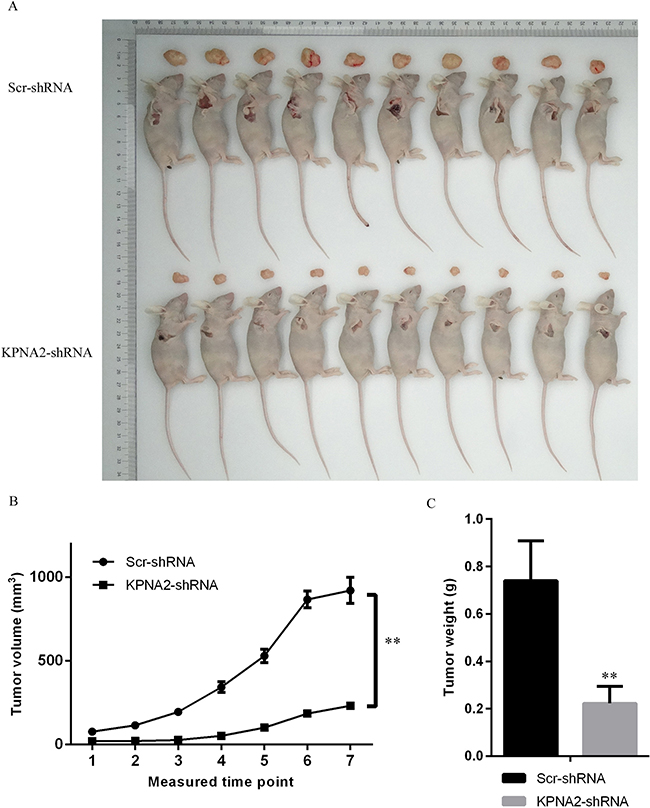 Figure 6: Tumorigenesis was inhibited by KPNA2 knockdown in a xenograft hepatocellular carcinoma model in nude mice. (A) Representative images of tumor size in nude mice injected subcutaneously with SMMC-7721 hepatocellular carcinoma cells infected with either Scr-shRNA or KPNA2-shRNA. The tumor volume was examined twice each week, starting from the 10th day after tumor cell injections, for a total of 7 measurements. The mice were killed on the 29th day for tumor weight analysis. (B) Tumor volume examination in nude mice injected subcutaneously with SMMC-7721 hepatocellular carcinoma cells infected with either Scr-shRNA or KPNA2-shRNA. The data shown are the mean ± SEM of the tumor volume from 10 nude mice per group (**p < 0.01). (C) Tumor weight in nude mice injected subcutaneously with SMMC-7721 hepatocellular carcinoma cells infected with either Scr-shRNA or KPNA2-shRNA. The data shown are the mean ± SEM of tumor weight from 10 nude mice per group (**p < 0.01).