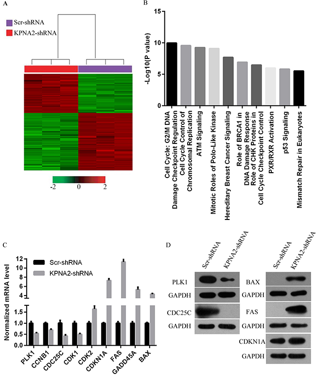 Figure 7: Widespread changes in gene expression and pathways essential for tumorigenesis in human hepatocellular carcinoma cell line HepG2 with KPNA2 knockdown revealed by microarray analysis. (A) Heat map representation of 1585 genes with significant differential expressions in HepG2 human hepatocellular carcinoma cells infected with lentiviruses expressing either Scr-shRNA (purple) or KPNA2-shRNA (red) under the significance criteria of P < 0.05 and | fold change | > 1.5. Genes and samples are listed in rows and columns, respectively. A color scale for the normalized expression data are shown at the bottom of the microarray heat map (green represents downregulated genes, while red represents upregulated genes). (B) Functional pathway enrichment was analyzed using IPA. Here, the top 10 enriched pathways were shown. The statistical significance shown on the x-axis is represented by the inverse log of the P value. (C) Confirmation of microarray data using real-time quantitative PCR for selected genes PLK1, CCNB1, CDC25C, CDK1, CDK2, CDKN1A, FAS, GADD45A and BAX in HepG2 human hepatocellular carcinoma cells infected with lentiviruses expressing either Scr-shRNA or KPNA2-shRNA. The data shown here are from one of three independent experiments (p < 0.01) and are normalized to GAPDH. (D) Protein level of PLK1, CCNB1, CDC25C, CDK1, CDK2, CDKN1A, FAS, GADD45A and BAX in HepG2 human hepatocellular carcinoma cells infected with lentiviruses expressing either Scr-shRNA or KPNA2-shRNA. GAPDH was used as an internal control.