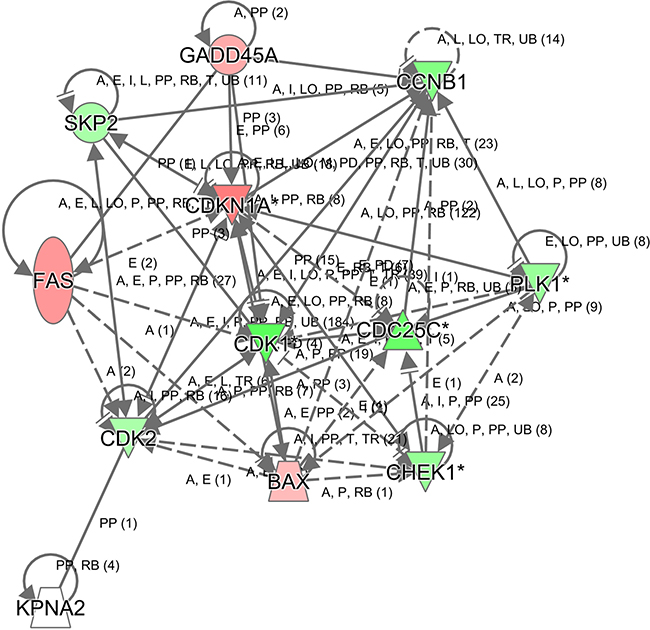 Figure 8: Modulation of the CDKN1A-CDK1-mediated gene interaction network in human hepatocellular carcinoma cell line HepG2 after KPNA2 knockdown. In the figure, genes represented in green are downregulated, while genes in red are upregulated in HepG2 cells after KPNA2 knockdown. The solid line represents direct interactions, while the dotted line represents indirect interactions.