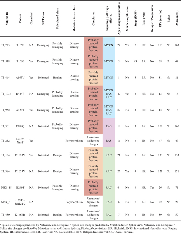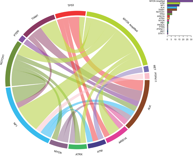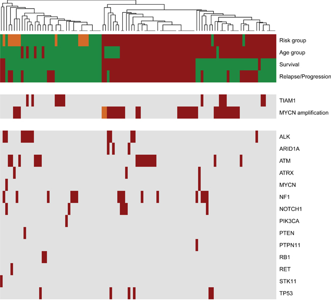 Statistics were performed using R software (version 3.2.3). The heatmap diagram was performed to represent the most relevant clinical data and potentially pathogenic variants detected. The distance measure used for heatmap clustering was Manhattan and the clustering method was Average. Circos diagram was generated with R for visualizing data of concomitantly mutated genes and/or MYCN amplification. The diagram does not include patients with only one alteration. The survival curves were plotted according to the Kaplan–Meier method and comparisons were performed by log-rank test. A Cox regression analysis was used for multivariate analysis. A p value ≤0.05 was considered statistically significant. Relapse-free survival (RFS) was defined as the time from diagnosis to the time of first occurrence of relapse, progression or last follow-up; and overall survival (OS) was defined as the time from diagnosis until death or until last follow-up if the patient was alive.