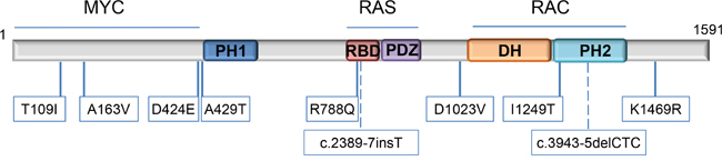 Figure 4: Location of TIAM1 variants. Variants are mapped to specific amino acids on the TIAM1 linearized protein model. The specific domains are indicated (from the N-terminus onwards according to amino acid sequence): PH1: N-terminal PH domain; RBD: RAS-binding domain; PDZ: PSD-95/DlgA/ZO-1 domain; DH: DBL homology domain/ RHOGEF domain and PH2: C-terminal PH domain. Locations of the 2 intronic variants are represented by dashed lines. Proteins reported to bind with certain regions of TIAM1 are indicated above the structure.