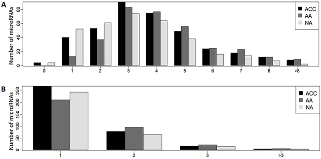 Figure 2: (A) Distribution of isomiRNAs and (B) seed sequences per miRNA in adrenocortical carcinoma (ACC), adrenocortical adenoma (AA), and normal adrenal cortex (NA).