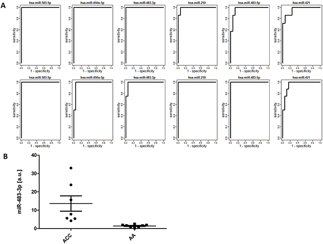 Since the most important task in diagnosis of adrenocortical tumors is a sensitive and specific identification of malignancy, we tested whether microRNA profiles distinguish between malignant (ACC) and non-malignant (AA + NA) tissue. Based on the Welch t-test results performed on the learning dataset, 72 miRNAs were selected for validation (FDR < 0.05) and 15 of them were positively validated (FDR < 0.05) on the independent set of samples (Table 2, Figure 1). These highly specific microRNA profiles distinguish between malignant and benign adrenal cortex in both analyzed datasets, as illustrated by the PCA analysis (Figure 1). Most importantly, 6 miRNAs: miR-503-5p, miR-483-3p, miR-450a-5p, miR-210, miR-483-5p, miR-421 can serve as potent discriminators between malignant an non-malignant adrenal cortex tissue, as their expression in ACC is significantly higher than in non-malignant group, and area under ROC curve, which is a measurement of prediction accuracy, exceeds 95% in both analyzed datasets (Figure 3A). Although miR-503-5p was the only one with 100% AUC in both datasets we propose miR-483-3p, miR-483-5p and miR-210 to be considered the best candidates for molecular testing of adrenocortical carcinomas, as the mean expression of these microRNAs is high in both datasets (>325 RPM), and thus easily measurable, and the miRNAs are undetectable in non-malignant tissue. To additionally assess the usefulness of these microRNAs in a single-miR based Taqman probe diagnostics, we analyzed the expression of miR-483-3p in adrenocortical carcinoma and adenoma samples. The analysis confirmed the results obtained in NGS, revealing a mean 9.7-fold difference in the microRNA expression between the two sample sets (p=0.008) (Figure 3B), and proved the possibility of measuring the expression of miRNAs in a commonly used Taqman analysis.