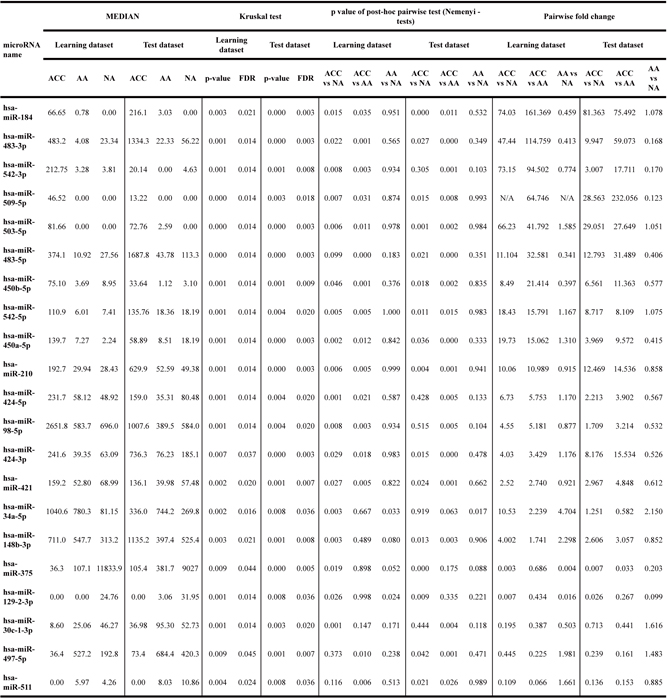 Over 130 million reads were obtained for the analyzed samples after demultiplexing, indicating an average of 5.7 million (M) reads per sample with a mean read number of 9.5M, 5.9M and 2.2M in the ACC, AA and NA groups, respectively. An average of 452 thousand (k) reads were aligned to the sequences of mature microRNAs from miRBase with a mean number of 465k, 658k and 234k reads in the ACC, AA and NA groups, respectively. Differences in number of reads were significant between ACC and NA (p=0.0003 and p=0.04 regarding total and aligned number of reads respectively) as well as between AA and NA (p=0.001 and 0=0.03). The numbers of total and aligned reads for each sample are provided in Supplementary Table 1.