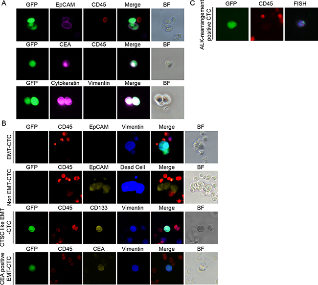 Figure 2: Viable CTC detection and phenotype characterization in NSCLC patients. Cancer cells from lung cancer tissues were infected with OBP-1101 and characterized by immunostaining for cell markers. (A) Lung cancer cells in lavage solution. EpCAM and cytokeratin were used as epithelial markers, whereas vimentin and CEA were used as a mesenchymal and cancer marker, respectively. (B) Dead CTCs showing positive epithelial marker signal and viable CTCs showing mesenchymal marker signal. CTCs were detected by green fluorescence produced by OBP-1101 in NSCLC patients. These CTCs were viable because the virus can replicate only in viable cells. Additionally, these CTCs were classified as having a mesenchymal phenotype because they were stained by an antibody against vimentin, which is a typical mesenchymal cell marker. The epithelial albeit GFP-positive CTCs were detected by EpCAM staining and these epithelial CTCs were positive in live/dead staining. CD133 and CEA were positive in CTCs with vimentin positive detected by OBP-1101. (C) FISH analysis of GFP-positive cells. To show ALK-rearrangement, GFP-positive cells in blood samples from the metastatic NSCLC patients with confirmed ALK-rearrangement in tumors were subjected to FISH analysis. The nuclei present a split positive pattern with separation between the 5′ ALK green part and the 3′ ALK orange part of the FISH probe, which is consistent with ALK rearrangement.