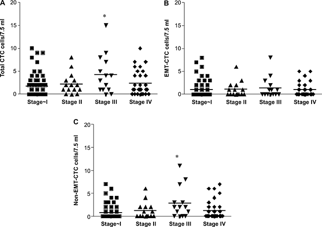 Figure 3: Distribution of CTC count in 7.5 mL peripheral blood from NSCLC patients according to stage. (A) Total CTCs, (B) EMT-CTCs, (C) Non EMT-CTCs.