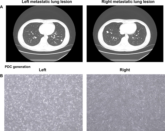 Figure 1: CT scan of the chest in giant cell tumor patient with left and right metastatic lung lesions (A). PDCs originated from left and right metastatic lung lesions, respectively (B).