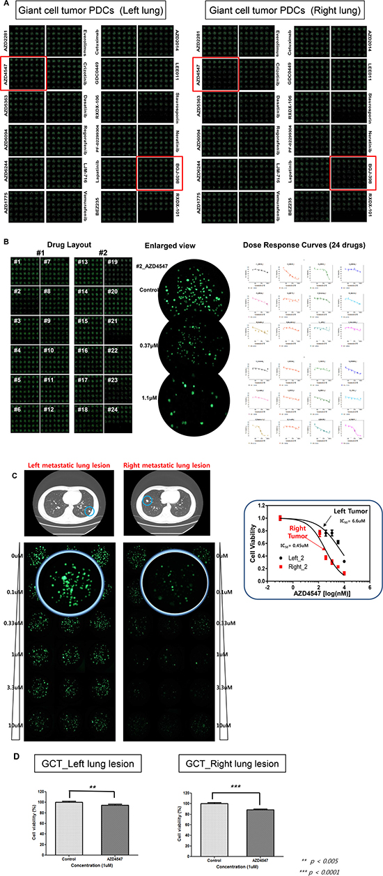 A 30-year-old man with a recurrent giant cell tumor received sacrectomy, coccygectomy and pelvic mass removal followed by postoperative radiotherapy 4 years ago. During regular follow-up, a chest computed tomography (CT) scan revealed two right and left pulmonary nodules (Figure 1A). The patient underwent metastasectomy for the right and left pulmonary nodules. At that time, patient-derived tumor cells from right and left surgical specimens were collected and cultured (Figure 1B). Cells were grown in 3D culture condition with alginate to be screened using micropillar/microwell chip system. 24 drugs (AZD2281, AZD4547, AZD5363, AZD6094, AZD6244, AZD1775, everolimus, crizotinib, dasatinib, regorafenib, LJM-716, vemurafenib, cetuximab, GDC0449, RXDX-106, PF-02299304, lapatinib, BEZ235, AZD2014, LEE011, staurosporin, neratinib, BGJ-398 were tested (Figure 2A). Based on the image analysis of the 3D cell culture HTS platform using PDCs, among 24 drugs tested AZD4547 and BGJ-398 demonstrated more significant growth inhibition of PDCs from the right pulmonary metastatic lesion as compared to left. Using 6 doses per drug in 6 replicates for right and left giant cell tumor PDCs, the dose response curves and corresponding IC50 values were calculated from the scanned images using the S+ Chip Analyzer. A sensitive response by corresponding IC50 values was also more significantly achieved for AZD4547 (FGFR2 inhibitor) and BGJ-398 (pan-FGFR inhibitor) in giant cell tumor PDCs originated from the right pulmonary nodule under the micropillar/microwell chip platform using 3D culture as compared to left (Figure 2B and 2C). The cell proliferation assay was also confirmed in monolayer culture using MTT assay (Figure 2D).
