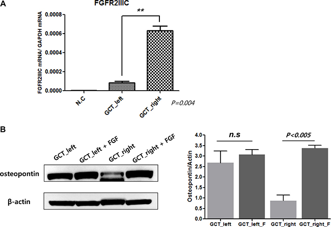 Figure 3: mRNA expression of FGFR2 IIIC in PDCs from left and right metastatic lung lesions, respectively (A). Baseline osteopontin level and changes of osteopontin by fibroblast growth factor (FGF) in PDCs from left and right metastatic lung lesions, respectively (B).