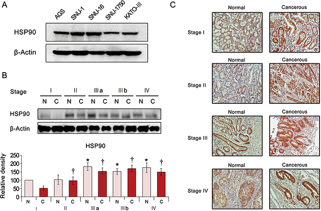 Figure 1: Expression of HSP90 in human gastric cancer cell lines and tissues. (A) Expression of HSP90 in the various human gastric cancer cell lines. (B) [Top] Western blot analysis of stomach specimens (N = 12) showing the expression of HSP90 according to tumor stage. Cancerous and adjacent normal stomach tissues from the same patient were termed “cancer” and “normal tissue”, respectively. [Bottom] Relative densities of these markers in each group. As tumor stage advanced, the expression of HSP90 increased in both cancer and normal tissues of the same patient. (C) HSP90 immunohistochemical staining of stomach specimens according to tumor stage. The expression of HSP90 showed the positive correlation with tumor stage.