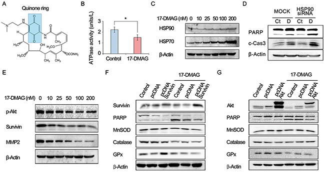 Figure 2: Action mechanism of 17-DMAG as an HSP90 inhibitor (canonical pathway). (A) Chemical structure of 17-DMAG which includes a quinone ring. (B) HSP90 ATPase activity assay demonstrating the inhibition of ATPase activity of Hsc90 by 17-DMAG. (C) Western blot analysis showing dose-dependent elevation of Hsp70 and HSP90 levels in AGS cells by 17-DMAG. (D) Western blot analysis to show efficiency of HSP90 siRNA. HSP90 inhibition by HSP90 siRNA promoted proapoptotic effects of 17-DMAG. (E) Western blot analysis showing the dose-dependent reduction of the expression of HSP90 client proteins, such as p-Akt, survivin, and MMP2 by 17-DMAG. (F-G) Western blot analysis to determine the anticancer effects as an HSP90 inhibitor (canonical pathway). Overexpressing HSP90 client proteins, such as survivin and Akt, did not considerably reduced the apoptosis of AGS cells. In addition, overexpressing the client proteins did not abrogate the potential of 17-DMAG reducing the expression of antioxidant enzymes (catalase, GPx, and MnSOD). Values represent means ± SD of three independent experiments. PARP, polyADP-ribose polymerase; GPx, Glutathione peroxidase; HSP, heat shock protein; MMP2, Matrix metalloproteinase 2; MnSOD, Manganase superoxide dismutase. *P < 0.05.
