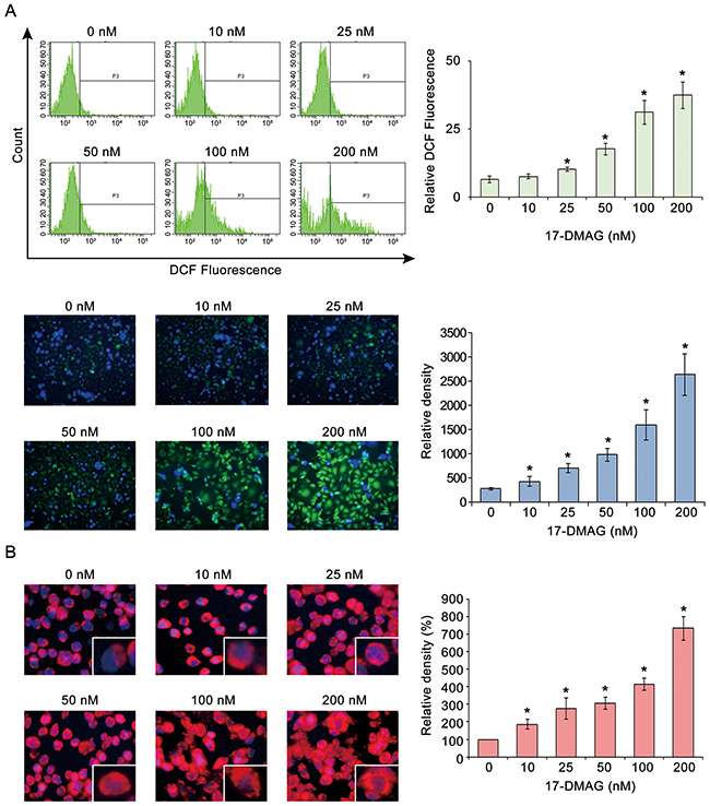 Figure 4: 17-DMAG effects on ROS in AGS gastric cancer cells. (A) Estimation of intracellular ROS levels by flow cytometric analysis of DCF fluorescence intensity [Top] and representative fluorescence microphotographs [Bottom] of AGS cells with DCF, all of which are proportional to cytosolic ROS levels [6]. All the data indicated that 17-DMAG increased the DCF-fluorescence (ROS levels, green signal) of AGS cells in a dose-dependent manner (P < 0.05), showing that 17-DMAG has the potential to elevate ROS levels in gastric cancer cells. (B) Quantification of superoxide levels in AGS cells as determined by MitoSOX staining (red signal). As the 17-DMAG concentration was raised, AGS cells more highly demonstrated bright red fluorescence, suggesting that 17-DMAG promotes mitochondrial superoxide synthesis dose-dependently. Values represent means ± SD of three independent experiments. DCF, 2’,7’-dichlorofluorescein. *P < 0.05.