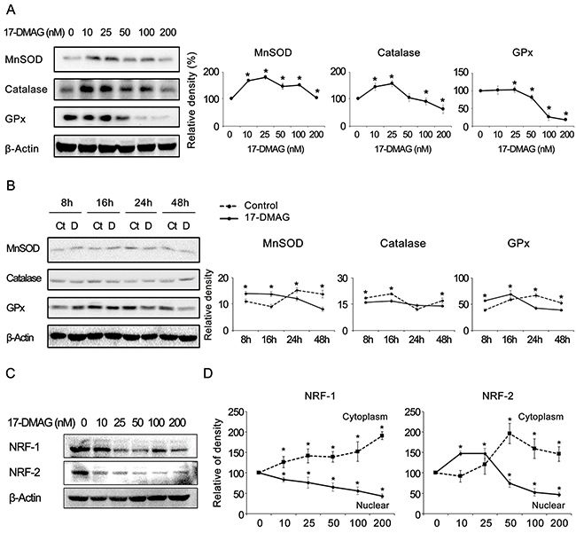 Figure 6: 17-DMAG effects on the expression of antioxidant enzymes and NRFs (NRF-1 and NRF-2) in gastric cancer cells (A-B) Western blot analysis to show the effects of 17-DMAG on the expression of antioxidant enzymes. 17-DMAG showed the potential of reducing the expression of the antioxidants (MnSOD, catalase, and GPx) both dose-(A) and time-(B) dependently (P < 0.05). (C) Western blot analysis showing the 17-DMAG potential of reducing the expression of the NRF-1 and NRF-2 dose-dependently. (D) The graph showing the relative densities of the bands of western blot analysis which was performed after separation of cytoplasmic and nucleic fractions of gastric cancer cells. The expression of both NRFs was dose-dependently decreased in the nuclei and increased in the cytoplasm after treatment with 17-DMAG. Values represent means ± SD of three independent experiments. GPx, Glutathione peroxidase; MnSOD, Manganase superoxide dismutase; NRF-1, nuclear respiration factor; NRF-2, nuclear respiration factor-2. *P < 0.05.