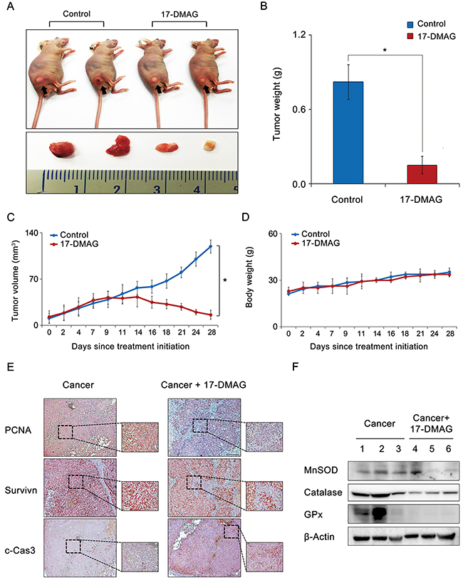 Figure 8: Effects of 17-DMAG on the growth of AGS cells xenografted in nude mice. After 17-DMAG (10 mg/kg/day) was administered intraperitoneally 3 times a week, mice were euthanized, and their tumors were collected. (A) Morphological images of mice with xenografted AGS cells and tumors in each group. Images of tumors before and after necropsy show that tumor shrinkage was more prominent in mice treated with 17-DMAG than in control mice (P < 0.05). (B) Final tumor weight at 4 weeks. A considerably greater reduction in tumor weight was observed in mice treated with 17-DMAG than in control mice (P < 0.05). (C) Tumor volumes were calculated according to the formula: volume = length × width2 × 0.5236. Note that a significant reduction in tumor volumes was detected in mice treated with 17-DMAG compared with control mice (P < 0.05). (D) Body weight changes during the experiment. The average body weight of mice in each group did not vary significantly over the course of the experiment. (E) Immunohistochemical stains demonstrating that 17-DMAG treated group exhibited the negative rates of PCNA and survivin expression and the positive rates of c-Caspase 9 expression. (F) Western blot analysis showing that 17-DMAG treated group exhibited significantly lesser expression of antioxidant enzymes than did the control group. c-Cas3: cleaved-caspase 3, GPx, Glutathione peroxidase; MnSOD, Manganase superoxide dismutase; PCNA, Proliferating cell nuclear antigen. *P < 0.05.