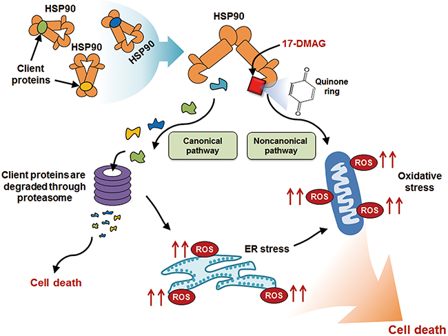 Figure 9: Possible anticancer action mechanism of 17-DMAG against gastric cancer cells. The anticancer mechanisms of 17-DMAG includes canonical and noncanonical pathways. In canonical pathway, 17-DMAG inhibits ATPase activity of HSP90 which stabilizes numerous oncoproteins. The client proteins which are not stabilized by HSP00 are degraded by the proteasome. In noncanonical pathway, 17-DMAG exerts its anticancer effects by altering oxidant-antioxidant balance which includes elevating ROS levels while decreasing the levels of antioxidant enzymes. The elevated ROS generation by 17-DMAG can be attributed to its quinone ring-bearing structure, which eventually forms ROS-generating radicals after reacting with flavin-containing reductases and ascorbates. In addition, HSP90 inhibition by 17-DMAG could induce ROS production, possibly as a consequence of elevated ER stress. Abbreviations: ER, Endoplasmic reticulum; HSP90, Heat shock protein 90; ROS, Reactive oxygen species.