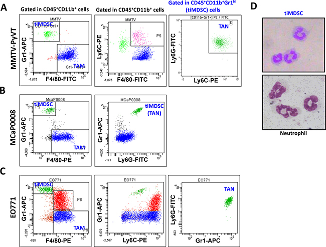 Figure 1: Phenotypes of tumor-infiltrating myeloid cell populations in breast tumor models. Single cell suspensions were prepared from breast tumor tissues. Expression of Gr1, F4/80, Ly6G, and Ly6C were analyzed in CD45+CD11b+ cells by flow cytometry. Representative flow images were shown. (A) CD45+CD11b+Gr1hiF4/80− and CD45+CD11b+Gr1−F4/80+ cells comprised two major populations in spontaneous MMTV−PyVT breast tumors. (B) and (C) There were three tumor-infiltrating myeloid cell populations in orthotopically implanted MCaP0008 and EO771 breast tumors. In all breast tumor models evaluated, the CD45+CD11b+Gr1hiF4/80− cell population was Ly6G+Ly6Clow. (D) Giemsa staining of cytospin preparations of tiMDSC and neutrophil. CD45+CD11b+Gr1hiF4/80− cells (tiMDSC) were purified from MMTV-PyVT breast tumor tissues. CD45+CD11b+Ly6G+Ly6C− cells (neutrophil) were isolated from peripheral blood. The phenotypes of tiMDSC, TAN and TAM were repeated more than 5 times.
