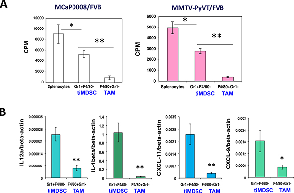 Figure 2: TAM is more immunosuppressive than tiMDSC in breast tumors. CD11b microbead was used to enrich tumor-infiltrating myeloid cells from MCaP0008 and MMTV-PyVT breast tumors. Flow sorting was used to purify tumor-infiltrating MDSC (tiMDSC: CD45+CD11b+Gr1hiF4/80−) and TAM (CD45+CD11b+Gr1−F4/80+). TiMDSCs and TAMs (5 × 104 cells) were then co-cultured with splenocytes (2 × 105 cells) for 24 hrs with anti-CD3/CD28 (1/5 μg/ml), and pulsed overnight with 1 μCi of 3H-thymidine. Cells were harvested, and 3H-thymidine uptake was measured. Splenocytes (2 × 105 cells) cultured in anti-CD3/CD28 (1/5 ug/ml) without myeloid cells were used as controls. (A) TAM inhibited T cell proliferation more potently than tiMDSC in MCaP0008 and MMTV-PyVT breast cancer models. (B) TiMDSC expressed higher levels of proinflammatory factors in MCaP0008 breast cancer. Data were shown as mean values ± SEM (n = 5–8 mice per group). Experiments were repeated three times. * denotes P < 0.05, ** denotes P < 0.01.