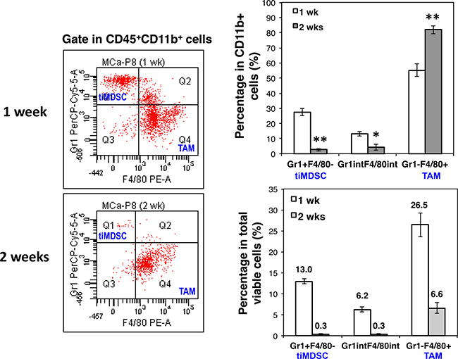 Figure 7: Breast cancer initiation is accompanied with a shift of tiMDSC to TAM. MCaP0008 tumor cells (1 × 106 cells) were inoculated in the mammary fat pads of FVB mice. Small tumors were harvested on day 7 or day 14 post tumor cell inoculation. Single cell suspensions were analyzed by flow cytometry. (A) Expression of Gr1 and F4/80 was analyzed in CD45+CD11b+ cells. The representative flow figures were shown. (B) The percentages of CD45+CD11b+Gr1hiF4/80−, CD45+CD11b+Gr1int/lowF4/80int/low, and CD45+CD11b+Gr1−F4/80+ in total CD45+CD11b+ cells. Data were shown as mean values ± SEM (n = 6 mice per group). The experiment was repeated three times. * denotes P < 0.05, ** denotes P < 0.01.