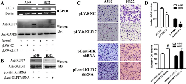 Figure 1: Overexpression of KLF17 inA549 and H322 cells inhibited the invasiveness of lung adenocarcinoma cells. (A, B) Using RT-PCR and Western blot, we found that KLF17 expression was increased in A549 and H322 cells infected with lentiviral particles containing pLV.0-KLF17, while the KLF17 protein was decreased in A549 and H322 cells infected with pLenti-KLF17 shRNA compared to the control(empty vector) groups; (C) Representative photomicrographs of invaded cells(×200) showed that the overexpression of KLF17 inA549 and H322 cells inhibited the invasiveness of the cells compared to that of the control groups. Downregulation of KLF17 in A549 and H322 enhanced the invasiveness of the cells compared to the control groups; (D) The graphs show the number of invaded cells/field in five Transwells(under×200 original magnification). Quantitative data represent means and SD of three independent experiments. (*#P < 0.05).