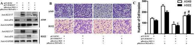 Figure 3: Enforced expression of uPA restored the KLF17-mediated anti-invasion effects in A549 and H322 cells. (A) Western blot analysis shows that enforced expression of uPA in A549 and H322 cells where KLF17 is also stably upregulated significantly increased uPA protein expression. GAPDH was used as a loading control. (B) Representative areas of invaded cells by the different A549 and H322 cells on the Transwell assay. (C) The graphs show the number of invaded A549 or H322 cells/field. Quantitative data represent means and SD of three independent experiments. *P value < 0.01 compared with uPA up-regulation group; #P value < 0.05 compared with KLF17 up-regulation group.