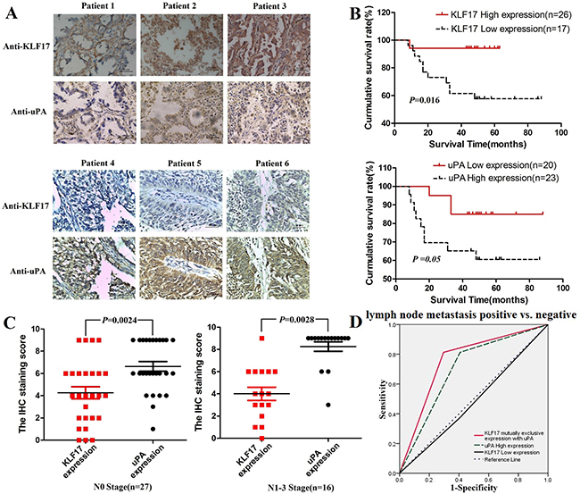 Figure 4: The expression of KLF17 in lung adenocarcinoma tissues was negatively correlated with the expression of uPA and was correlated with the overall survival time of patients. (A) Representative images from 43 cases of lung adenocarcinoma with KLF17 or uPA immunostaining (400×), scale bar: 50 μm; (B) The overall survival time of patients with lung adenocarcinoma was significantly different between the high-KLF17/low-uPA and low-KLF17/high-uPAexpression groups (KLF17, P < 0.05; uPA, P = 0.05); (C) The difference in the KLF17 and uPA immunostaining score between the lymph node metastasis positive and negative groups (p < 0.05). (D) ROC curve showing that KLF17 is mutually and exclusively expressed with uPA (AUC = 0.758, P = 0.005), uPA high expression alone (AUC = 0.703, P = 0.028), and KLF17 low expression alone (AUC = 0.484, P = 0.86) for the patients that are lymph node metastasis positive vs. patients that are lymph node metastasis negative.
