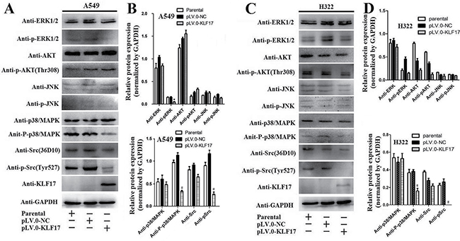 Figure 5: KLF17 inhibited the expression of phosphorylated-p38/MAPK and phosphorylated-Src. (A, C) Western blot analysis showed that the overexpression of KLF17 in A549 and H322 cells significantly decreased p-Src and p-p38/MAPK protein expression when compared to the cells infected with pLV.0-NC or the parental cells. But p-ERK was decreased in A549 cells but not in H322 cells in the KLF17-overexpression groups. (B, D) The histograms show that the p-Src and p-p38/MAPK protein levels were downregulated in A549 and H322 cells infected with lentiviral particles containing pLV.0-KLF17 compared to the parental cells or the cells infected with lentiviral particles containing pLV.0-NC (empty). Meanwhile, the p-AKT and p-JNK were not altered in the three groups. The experiments were repeated in triplicate, and the data are represented as the mean ± s.d. (*P < 0.05).