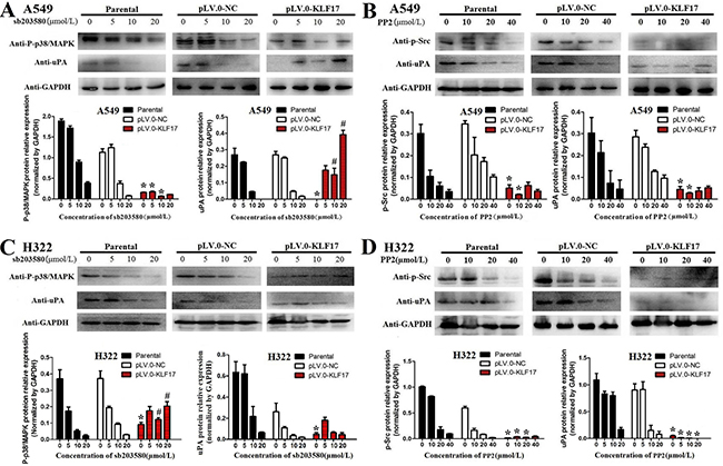 Figure 6: KLF17 negatively regulated the expression of uPA via the suppression of the Src and P38/MAPK signaling pathways. (A, B) Western blot and histograms show the p-p38/MAPK or uPA protein expression in the parental, NC control and KLF17-overexpression groups when the A549 and H322 cells were treated with different concentrations of SB 203580 (p38/MAPK inhibitor). (C, D) Western blot and histogram show the p-Src or uPA protein expression in the parental, NC control and KLF17-overexpression groups when the A549 and H322 cells were treated with different concentrations of HY-13805 (Src inhibitor). The experiments were repeated at least in duplicate, and the data are represented at the mean ± s.d. *#P value < 0.01 compared with NC group and parental group.
